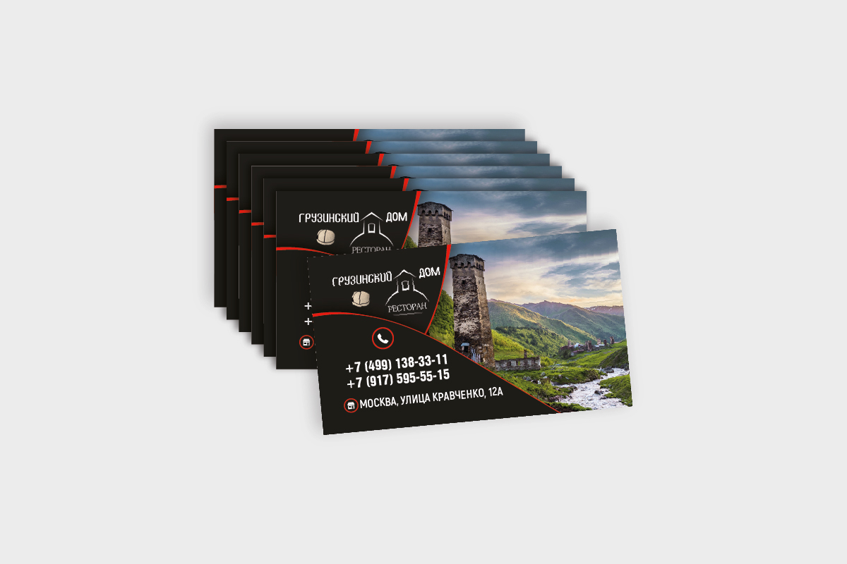 Напечатали 300 визиток, размер 90*50 мм, за 2 часа, для ресторана Грузинской кухни, бумага использовалась 300 гр, печать двухсторонняя
