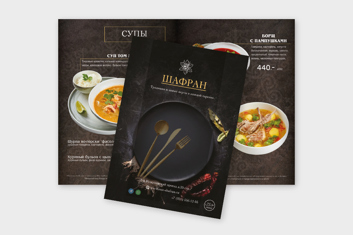 Многостраничная брошюр-меню для ресторана высокой кухни, бумага 300 гр, ламинация софт тач, размер в готовом виде А4 формата