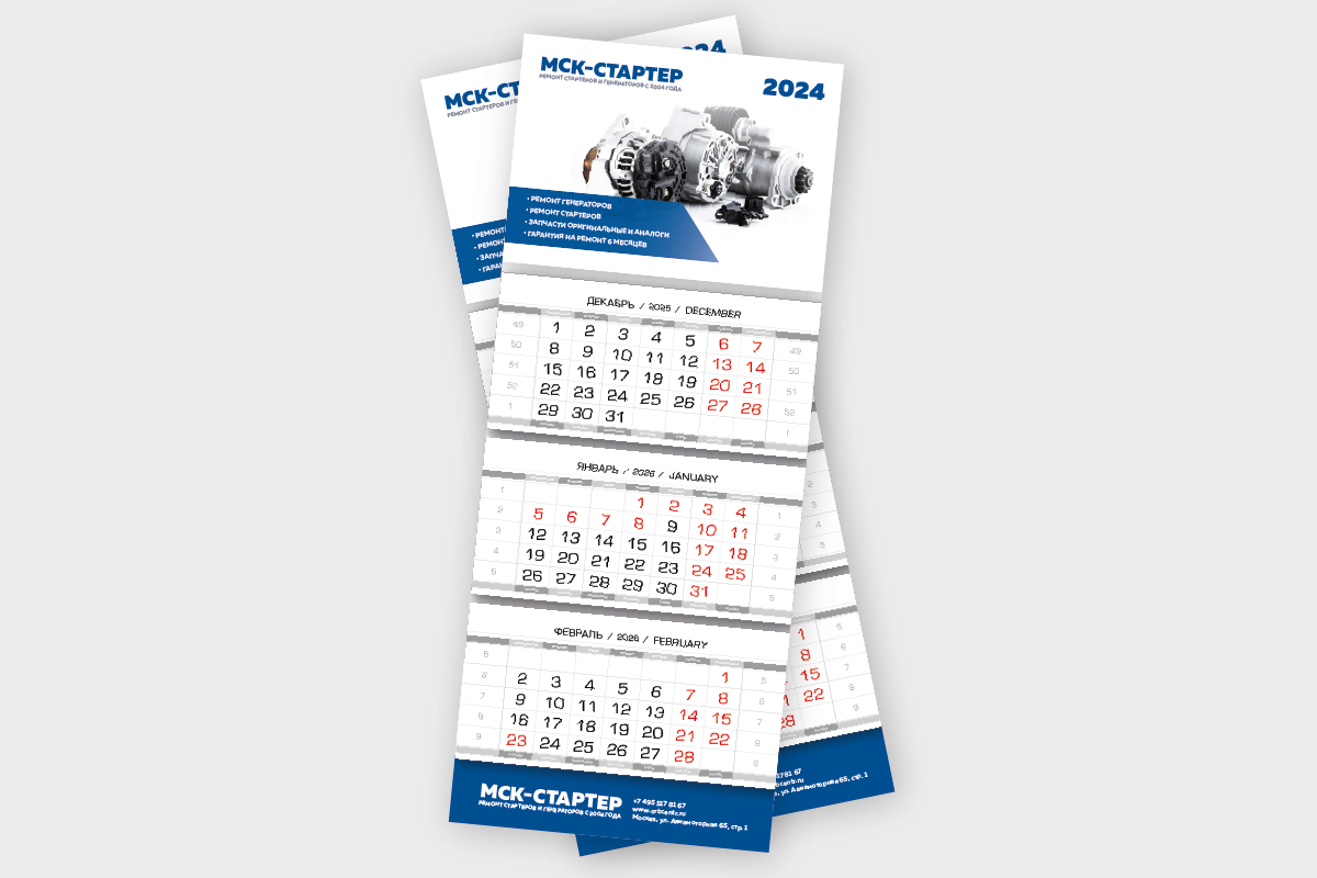 Квартальный календарь: модель Мини1, Обложка 300 гр + глянцевая ламинация 75 мкр, люверс, пружинка, отрывные календарные блоки, рекламное поле, курсор, тираж 200 шт