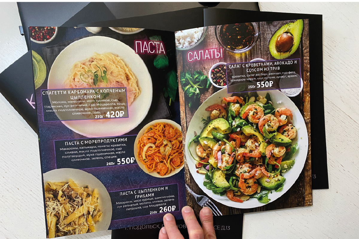 Меню для ресторана с фотографиями блюд, 24 страницы, формат А4 в готовом варианте, глянцевая ламинация 32 мкр на обложку, бумага 300 гр