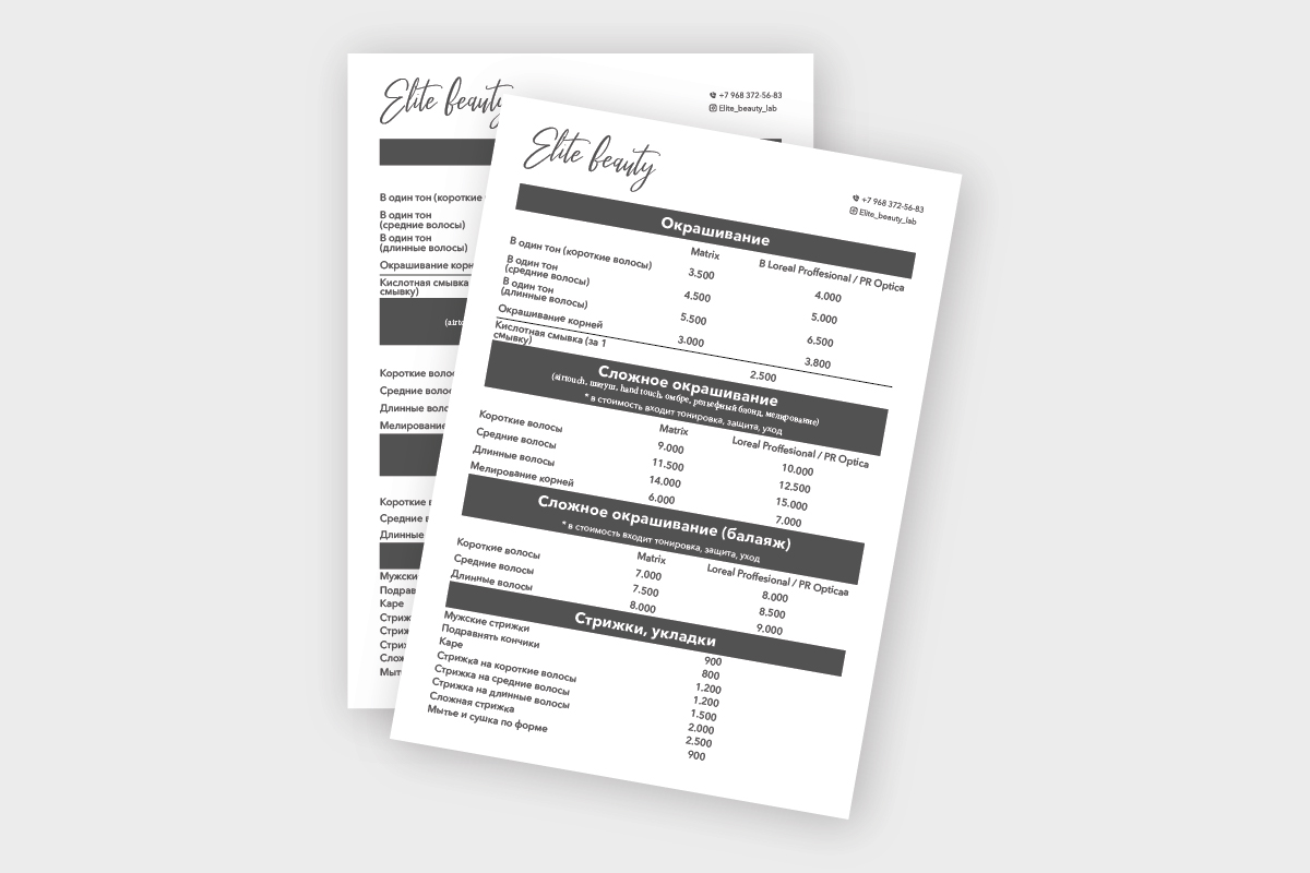 Прайс лист для салона красоты на услугу окрашивание волос, формат А4, бумага 300 гр, 4 шт