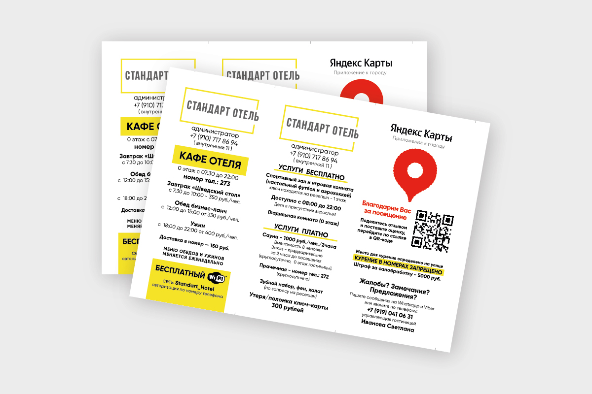 Яндекс пирамидка напечатана для отеля, цель сбор отзывов от туристов. Формат А4, бумага 300 гр, двухсторонний скотч, биговка, 44 шт